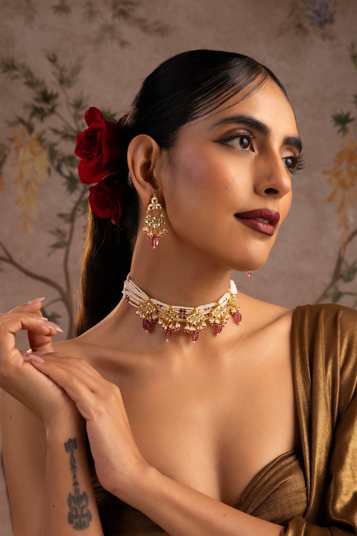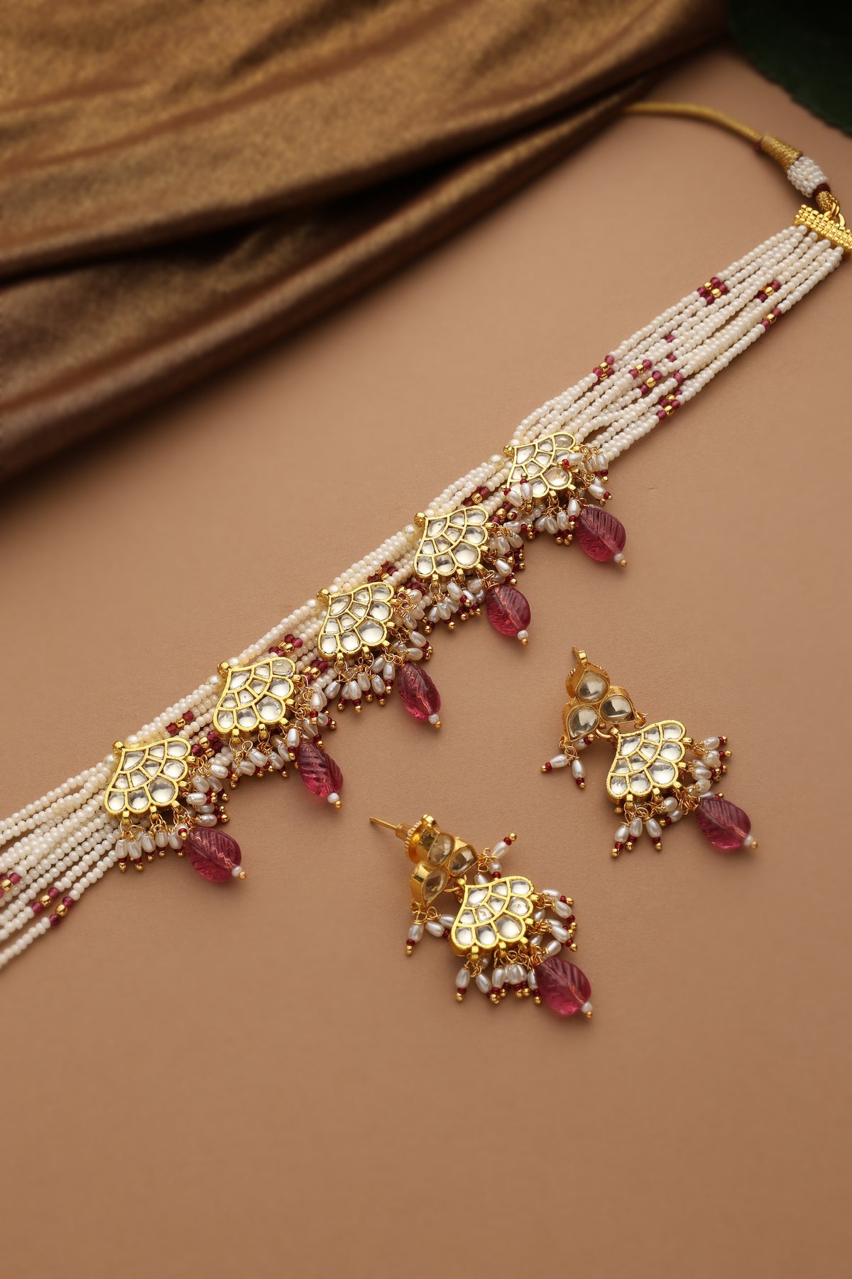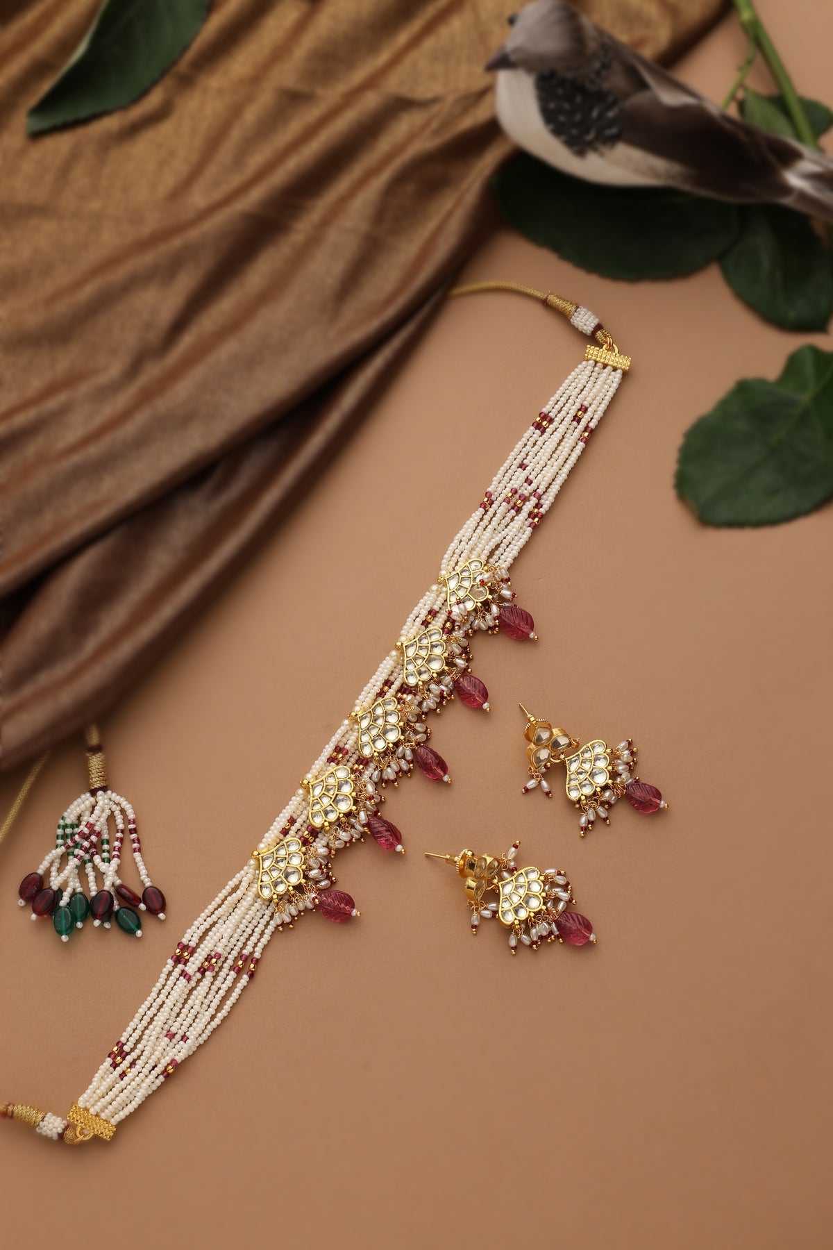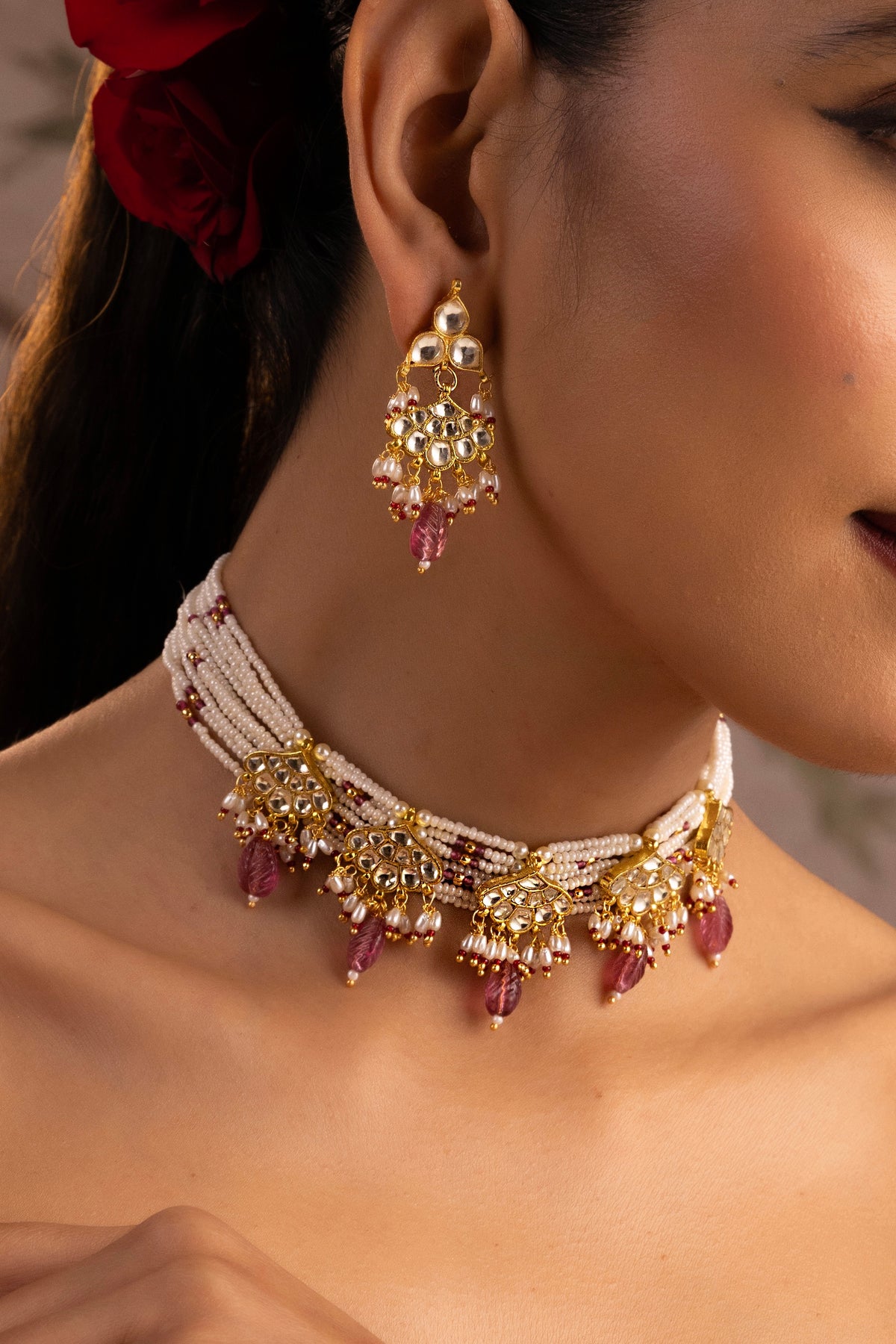 The Kesar Red Polki Choker Necklace Set is a radiant blend of tradition and festive charm. Crafted with multiple strands of fine pearls, the choker rests gracefully along the neckline, creating a rich and elegant silhouette. Intricate gold polki motifs adorn the center, accented with deep red bead drops that add warmth and vibrant contrast. Delicate detailing and subtle pearl clusters enhance its celebratory appeal.