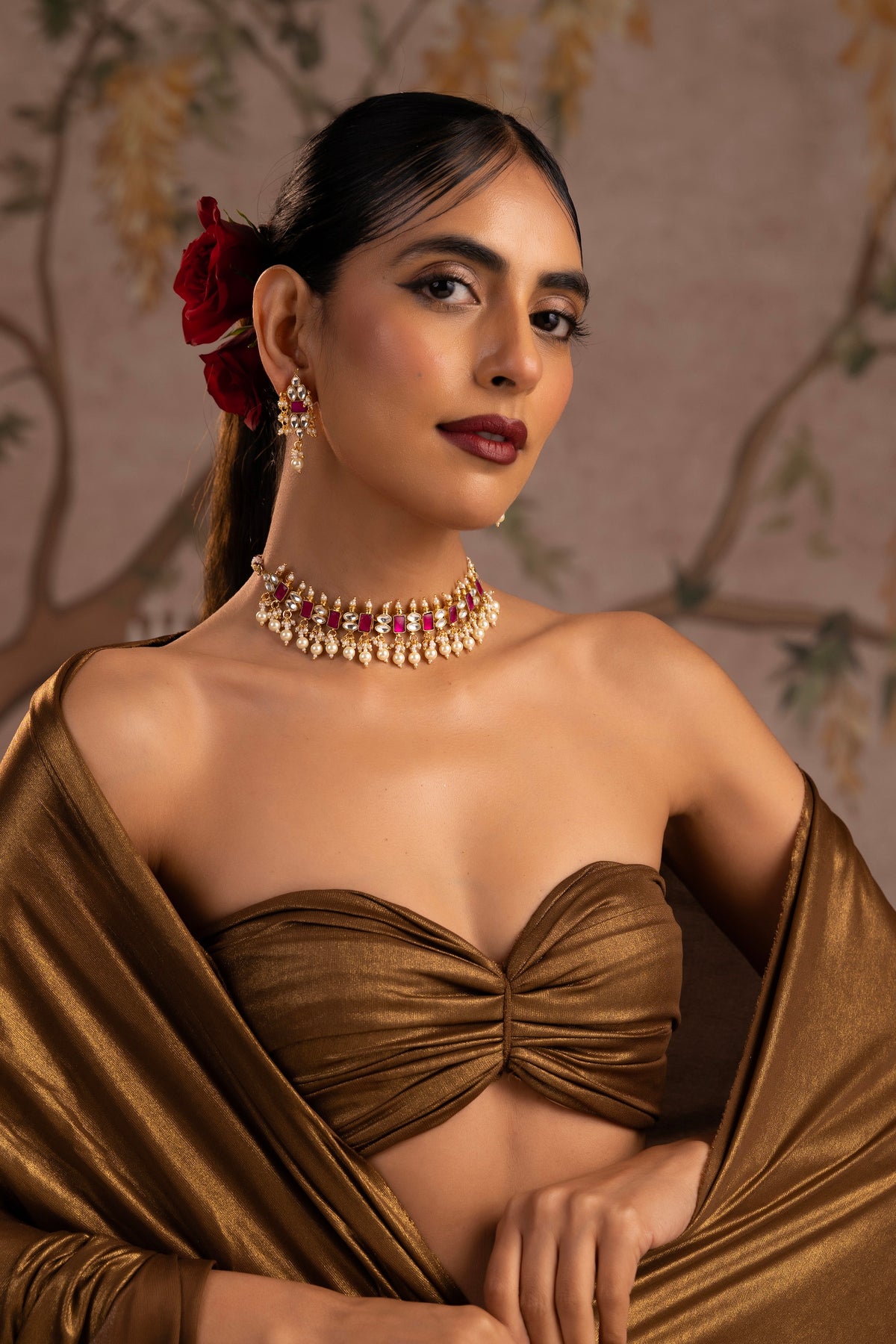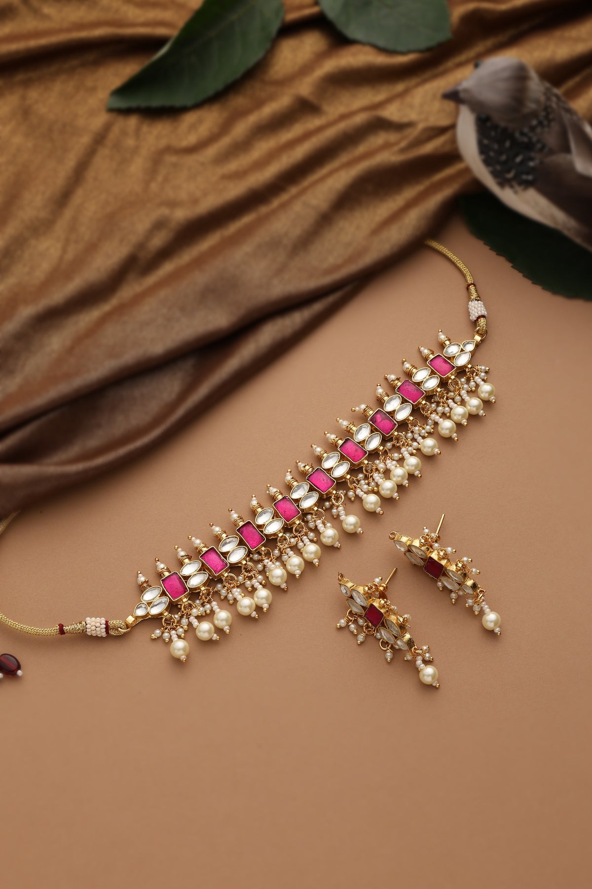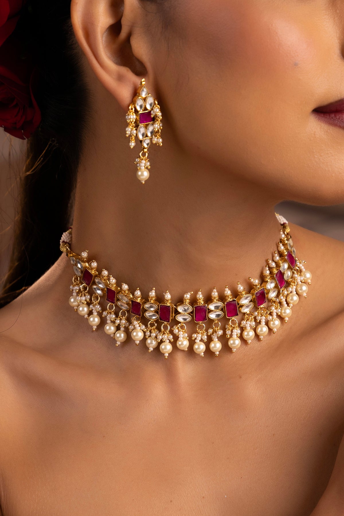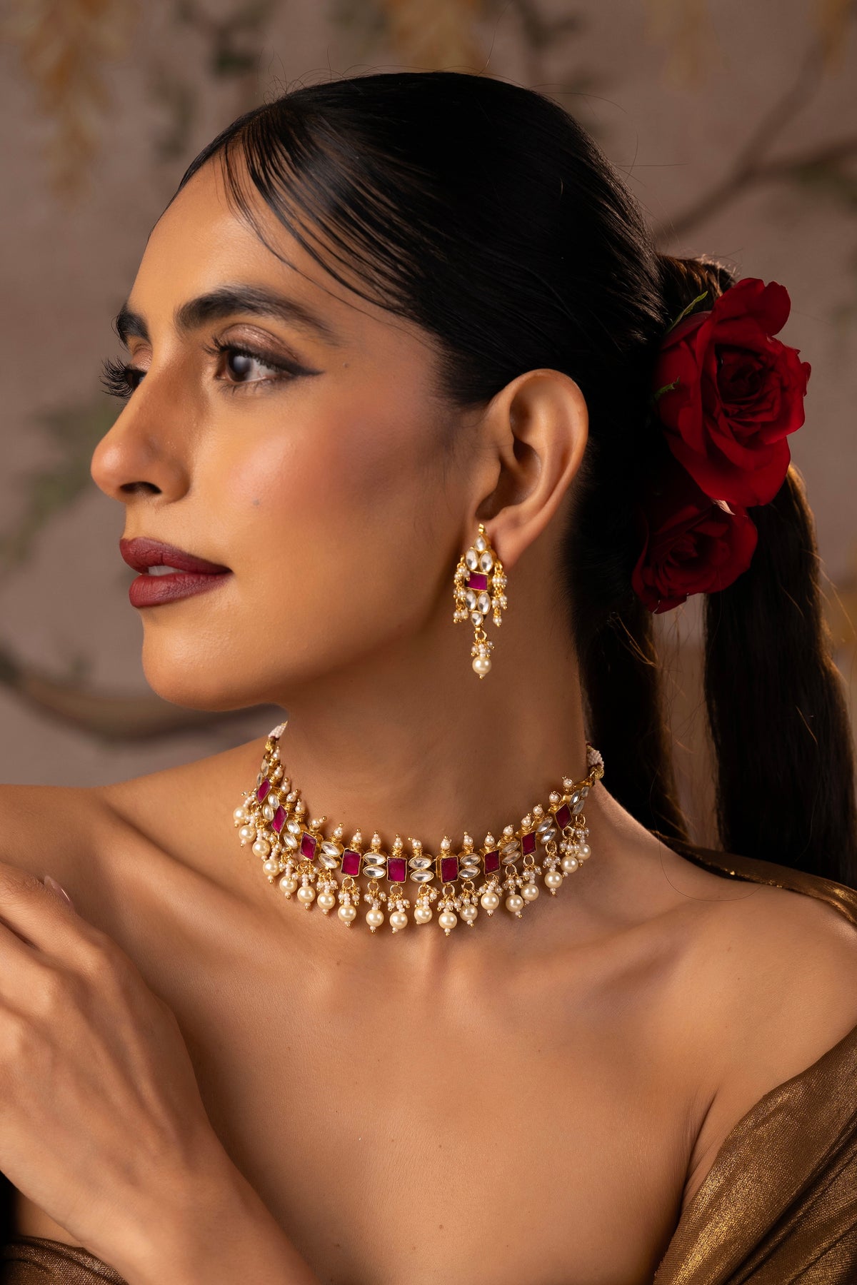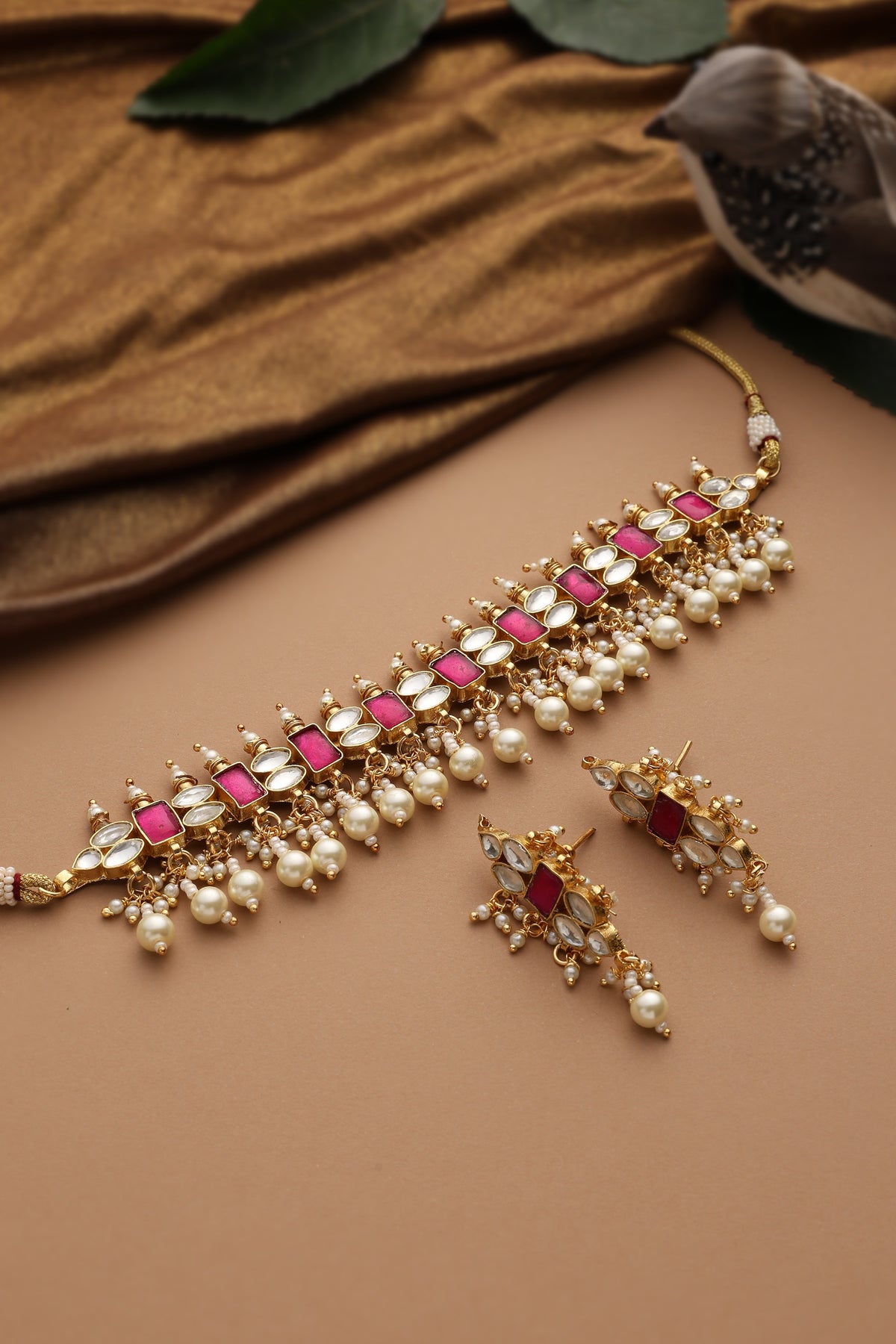 The Trisha Pink Polki Choker Necklace Set is a vibrant expression of festive elegance. Designed with a structured gold-toned base, the choker is adorned with radiant polki stones and striking pink rectangular accents that create a bold yet graceful pattern. Delicate pearl drops cascade along the edge, adding movement and a soft, celebratory charm.