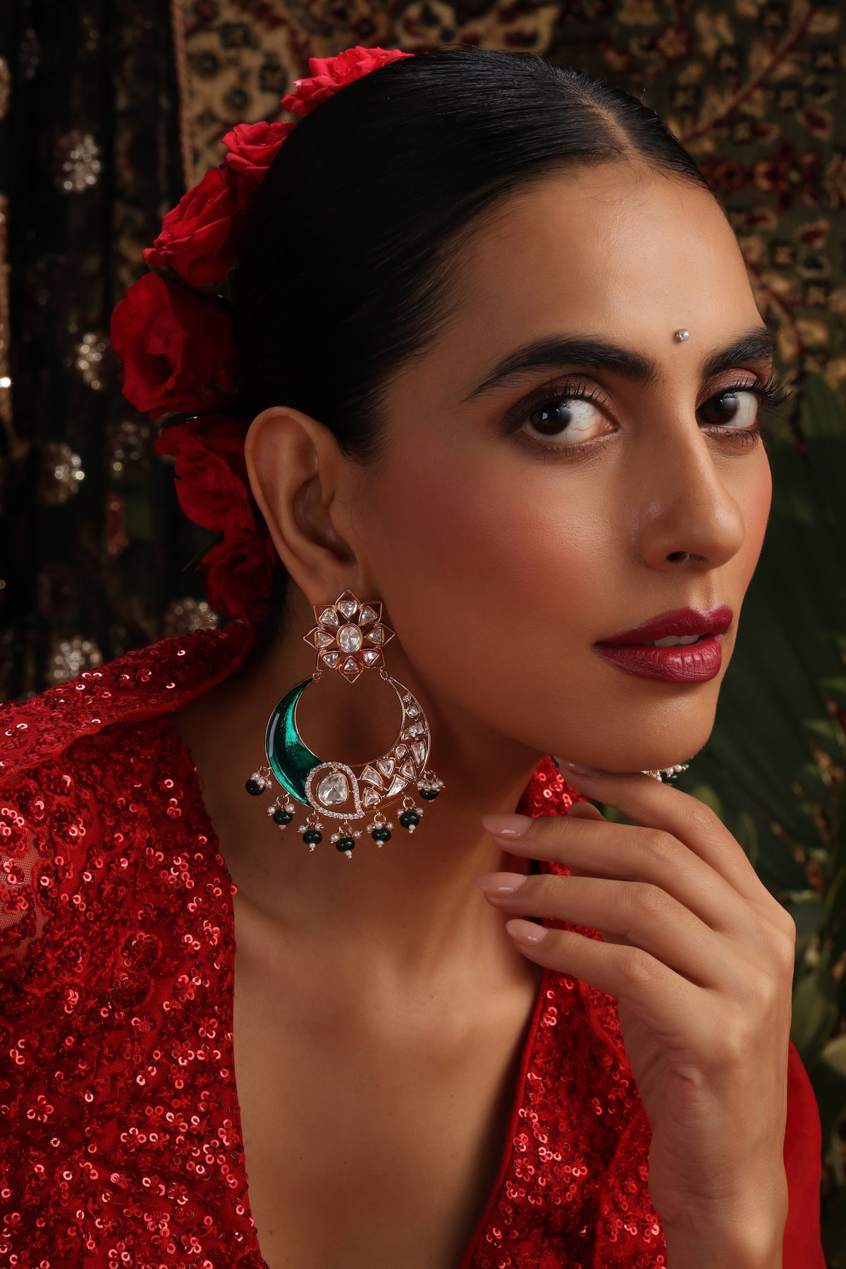 Bold, breathtaking, and beautifully crafted, the Rehana Green Polki Chandbali Earrings celebrate royal glamour with a modern edge. These statement chandbalis feature a stunning crescent silhouette adorned with hand-set uncut Polki stones that exude timeless radiance. The rich emerald green enamel adds a luxurious depth, while the floral stud top enhances the elegance of the design. Delicate beads and pearl droplets create graceful movement, making it perfect for weddings, sangeet nights, festive soirées, and regal celebrations. A true head-turner, these earrings are made for women who love dramatic yet sophisticated jewellery with heritage charm.