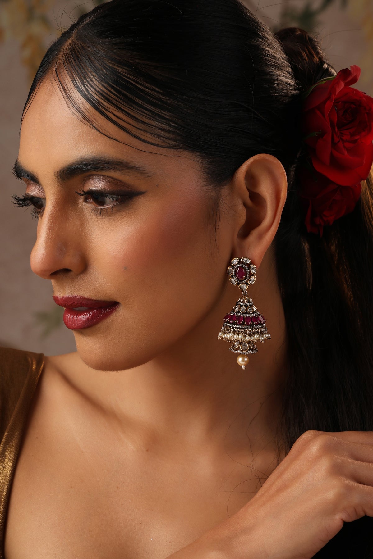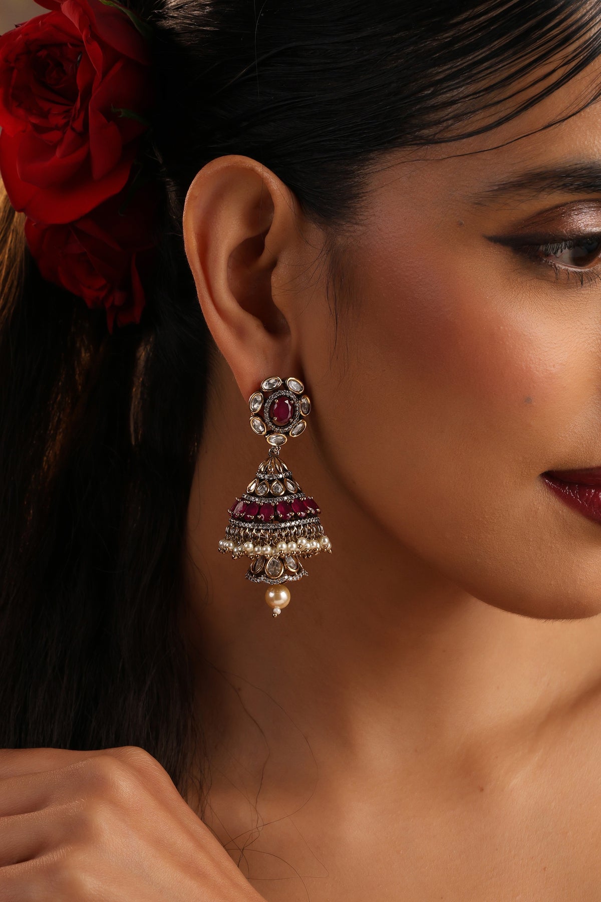 Mahi Red Polki Jhumka Earrings are a radiant celebration of timeless Indian elegance and intricate craftsmanship. Designed with luminous uncut polki stones, the earrings feature a regal red centerpiece that adds depth and richness to the design. The beautifully layered jhumka dome is adorned with vibrant ruby-toned accents, delicate pearl drops, and fine detailing that creates graceful movement with every step. Set in an antique gold finish, Mahi embodies the charm of heirloom jewellery while offering a striking festive statement. Perfect for weddings, celebrations, and grand occasions, these earrings bring together tradition, opulence, and unforgettable sparkle.