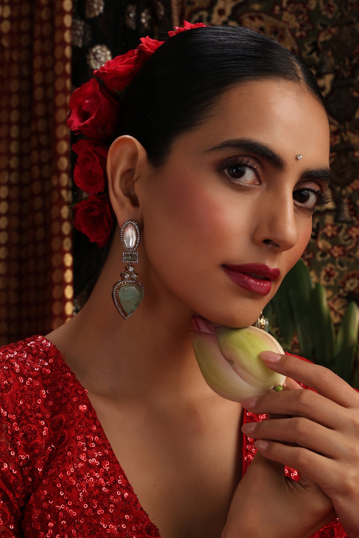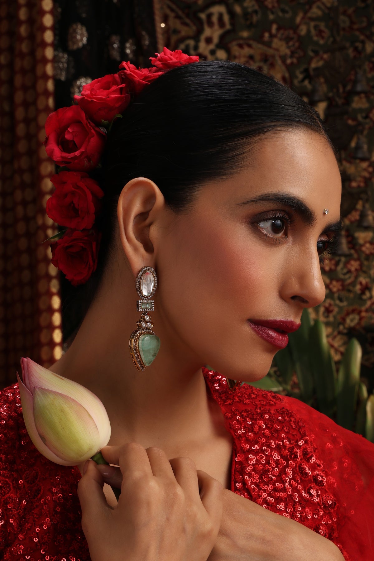 The Niamh Mint Polki Dangler Earrings exude soft sophistication and serene luxury. Designed in an elongated silhouette, these elegant earrings feature hand-set uncut Polki stones paired with stunning mint green gemstone drops that add a refreshing touch of colour. Each element is beautifully framed with sparkling CZ accents, enhancing the brilliance and craftsmanship of the design. The combination of gold tones and pastel hues creates a graceful fusion of modern charm and traditional aesthetics. Perfect for weddings, festive occasions, cocktail evenings, or royal celebrations, it adds an effortless statement to any ensemble—subtle yet undeniably captivating.