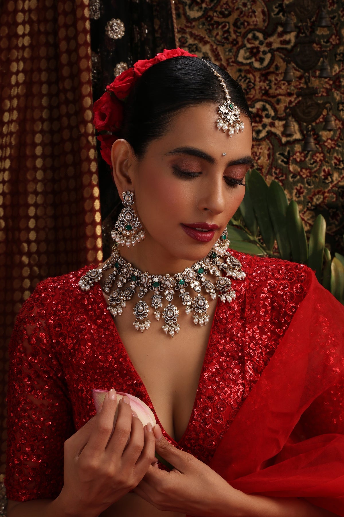 Ruaab Green Polki Necklace Set with Maang Tikka.