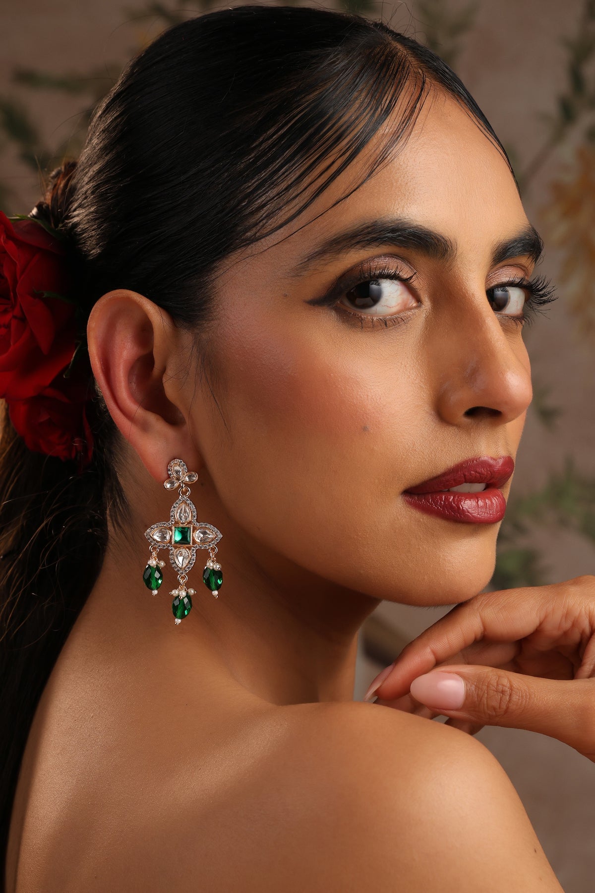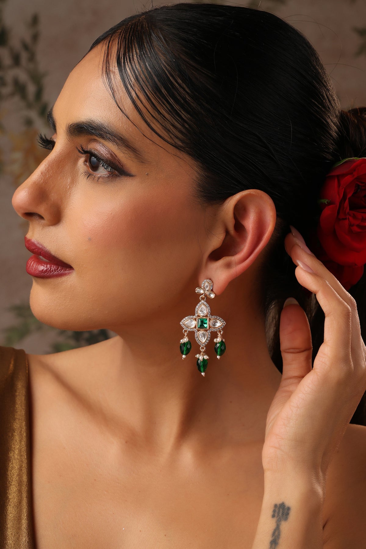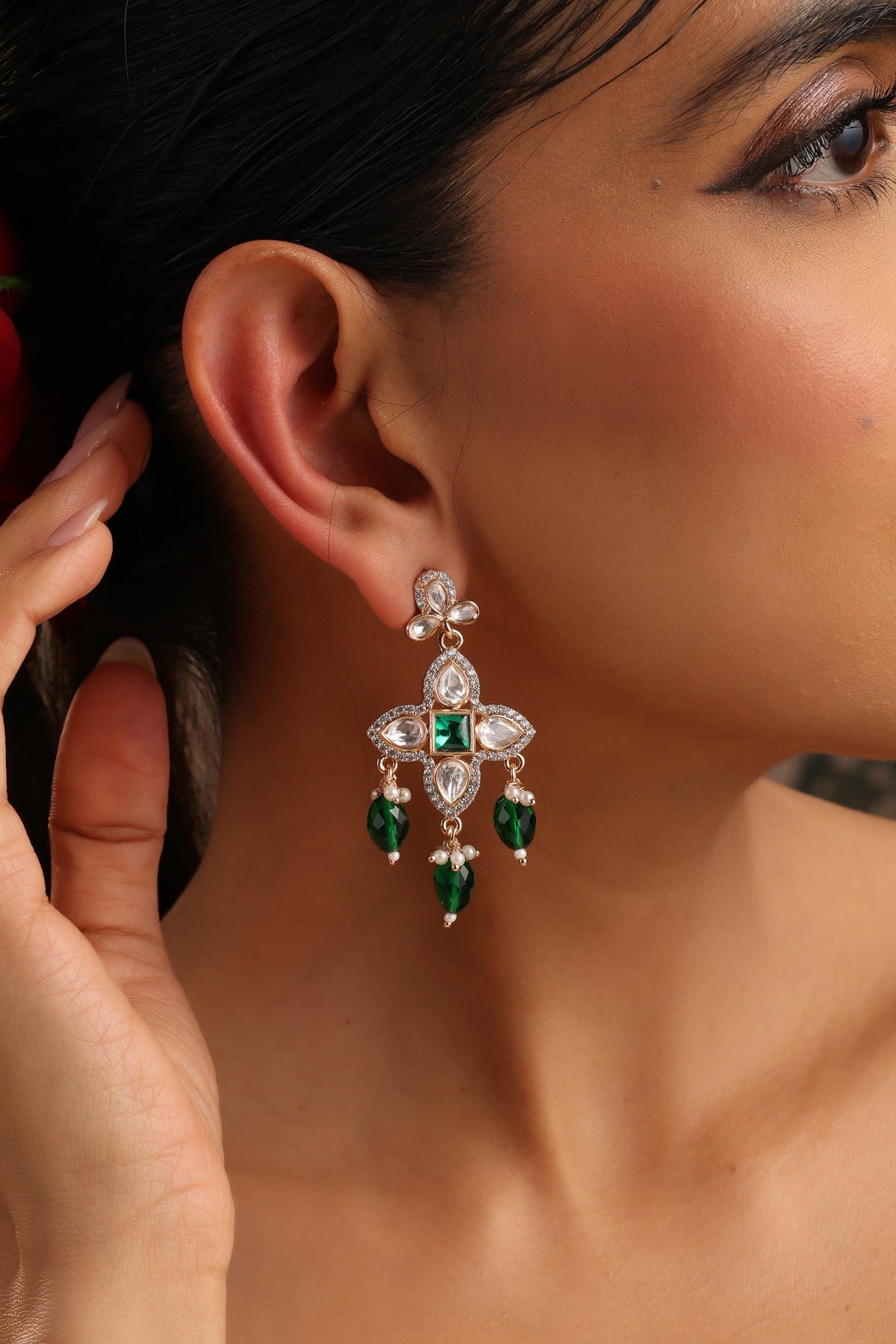 Ojhal Green Polki Dangler Earrings are a graceful blend of delicate design and timeless sparkle. Crafted with radiant uncut polki stones arranged in a floral-inspired pattern, the earrings are highlighted by a vibrant emerald-toned centerpiece that adds richness and depth to the design. The elegant dangler silhouette flows into luminous green bead drops and tiny pearl accents, creating soft movement and a refined charm with every step. Set in a warm antique gold finish, Ojhal beautifully captures the essence of traditional Indian jewellery while offering a fresh, contemporary elegance perfect for festive occasions, weddings, and sophisticated celebrations.