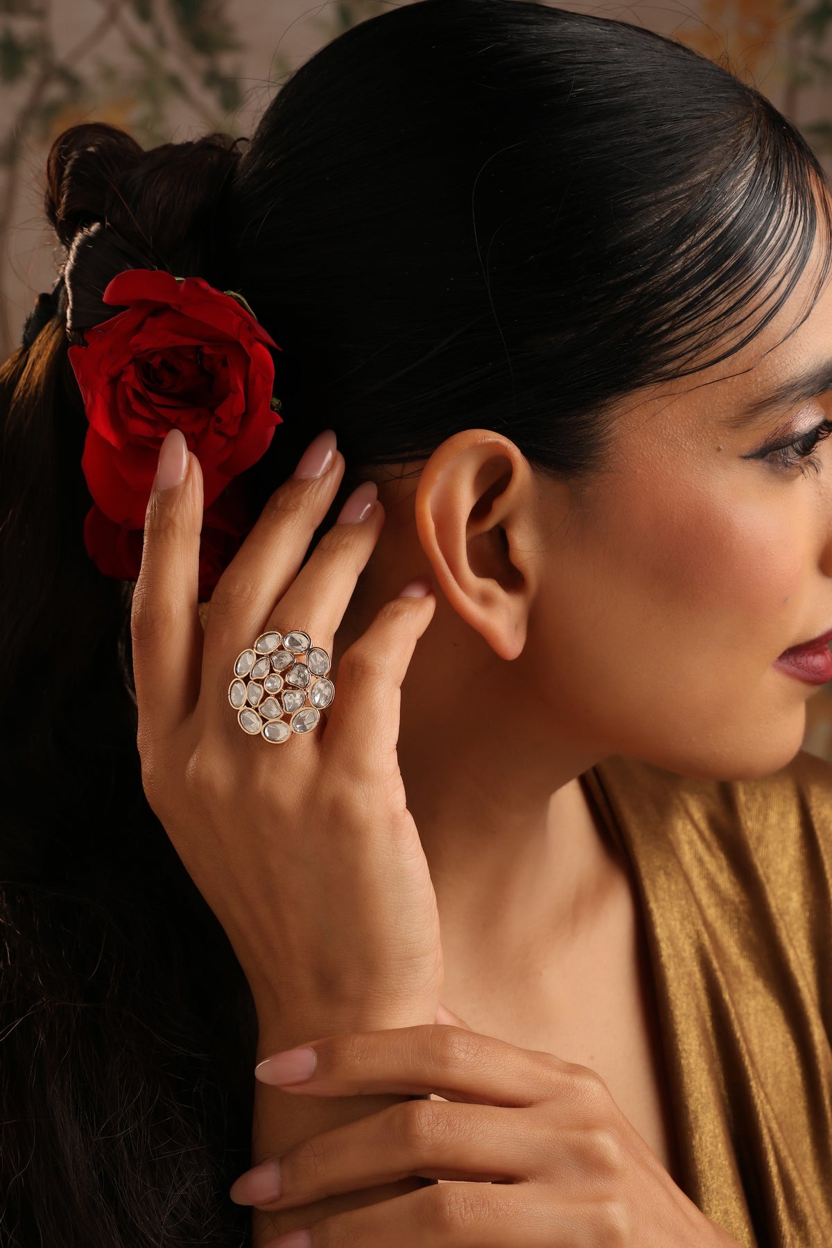 Delicate yet dazzling, the Ela Rose Gold Polki Ring is a graceful celebration of timeless craftsmanship. Designed in a beautiful floral cluster, luminous polki stones are carefully arranged to create a radiant bloom that catches the light from every angle. Set in a warm rose gold finish, the ring blends classic heritage with a soft contemporary elegance. Its intricate detailing and harmonious symmetry make it both refined and eye-catching. Perfect for festive occasions, intimate celebrations, or elevating everyday elegance, Ela adds a subtle sparkle and a touch of regal charm to your jewellery collection.