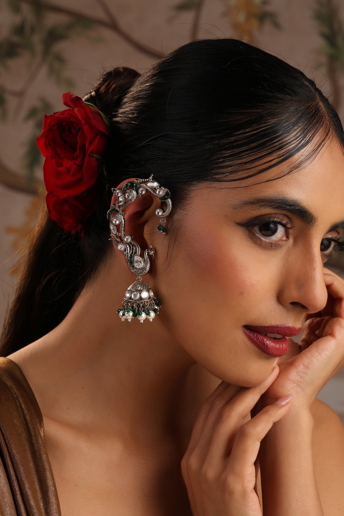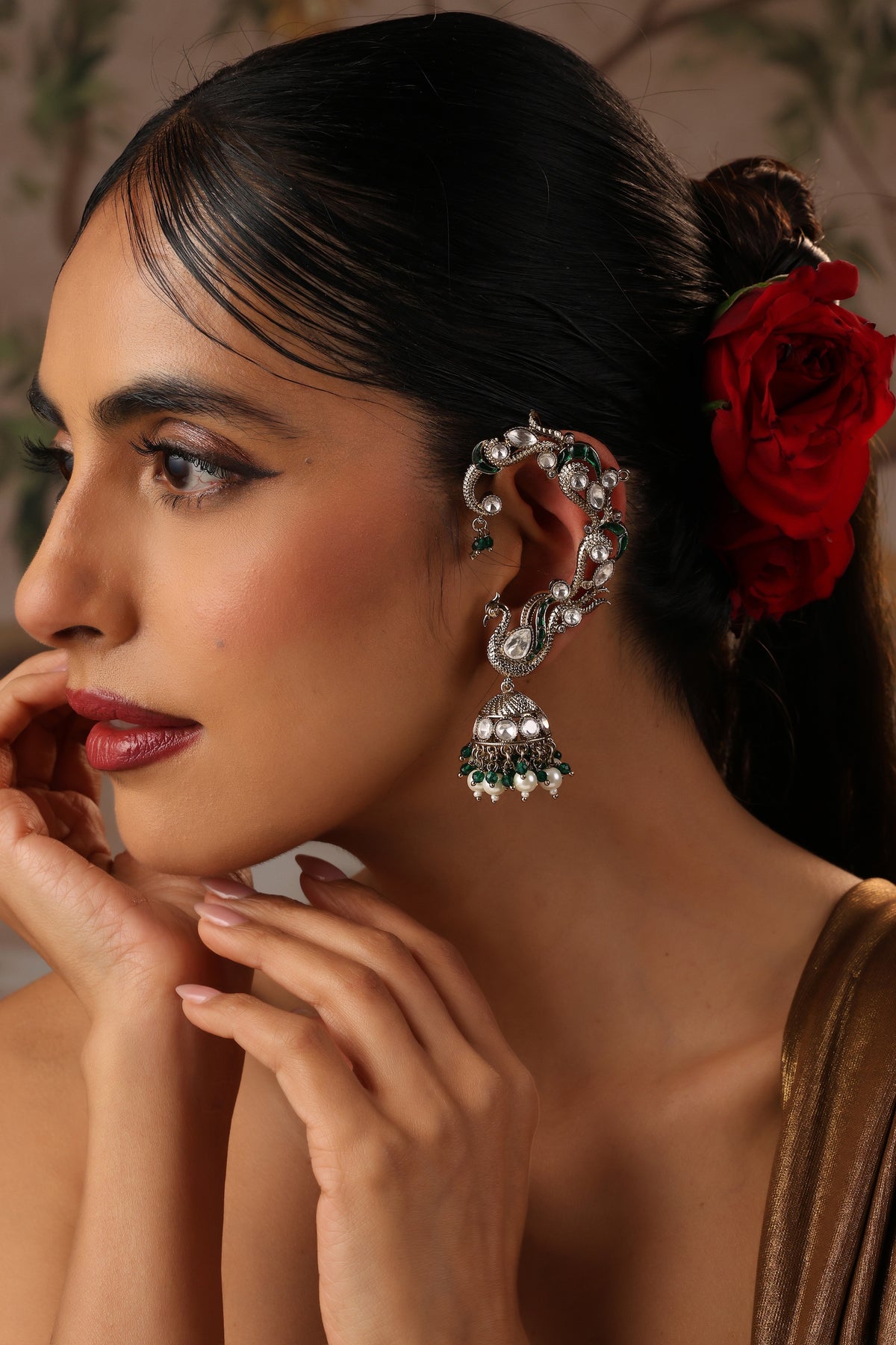 Gaavna Emerald and Polki Ear Cuff Earrings are a poetic blend of heritage and bold artistry, sculpted to trace the ear like a jeweled vine in full bloom. Intricately set with luminous polki stones and rich emerald accents, the design curves gracefully into a majestic peacock motif, finished with delicate jhumka drops adorned in pearls and green beads. The antique gold finish enhances its regal charm, while the ear cuff silhouette creates a statement that feels both traditional and strikingly contemporary. Perfect for weddings, festive soirées, or heirloom moments, Gaavna is not just jewellery, it is wearable grandeur with a whisper of royal nostalgia.