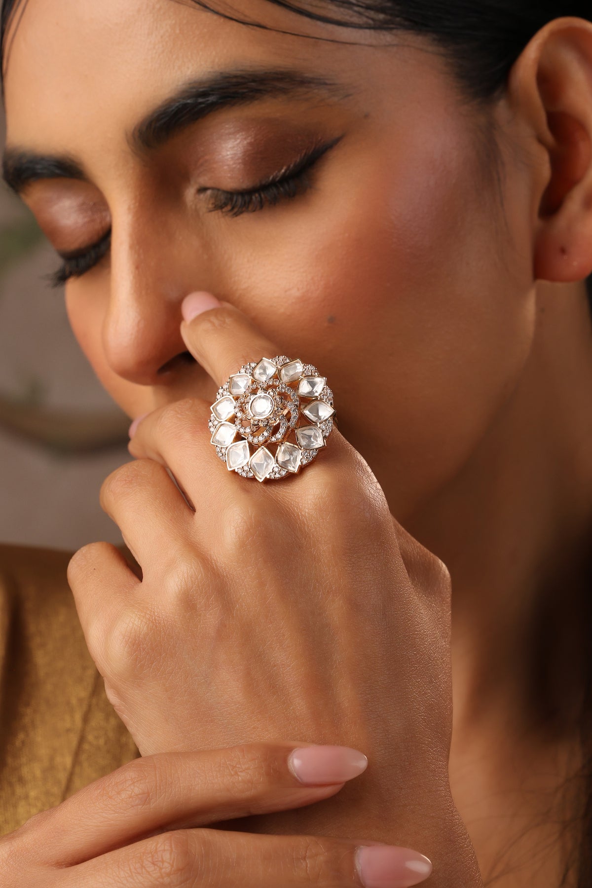 Lavika Rose Gold Polki Ring is a breathtaking statement piece that captures the essence of timeless elegance and regal craftsmanship. Designed in a striking floral silhouette, the ring features radiant uncut polki stones arranged in a delicate bloom, with a sparkling swirl of crystals at its center that adds depth and brilliance. The warm rose gold finish enhances the soft glow of the stones, creating a perfect harmony of vintage charm and contemporary sophistication. Bold yet graceful, Lavika is crafted to stand out, making it an exquisite choice for weddings, festive celebrations, and glamorous evening occasions.