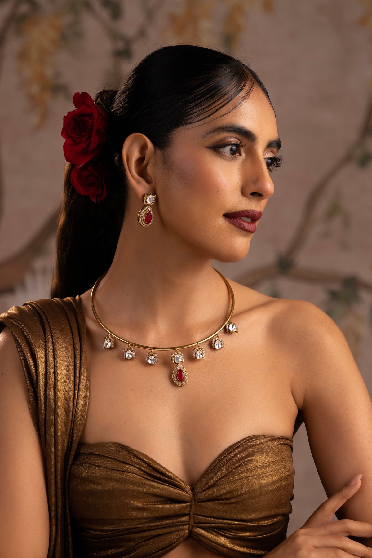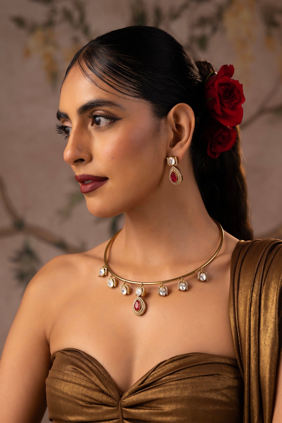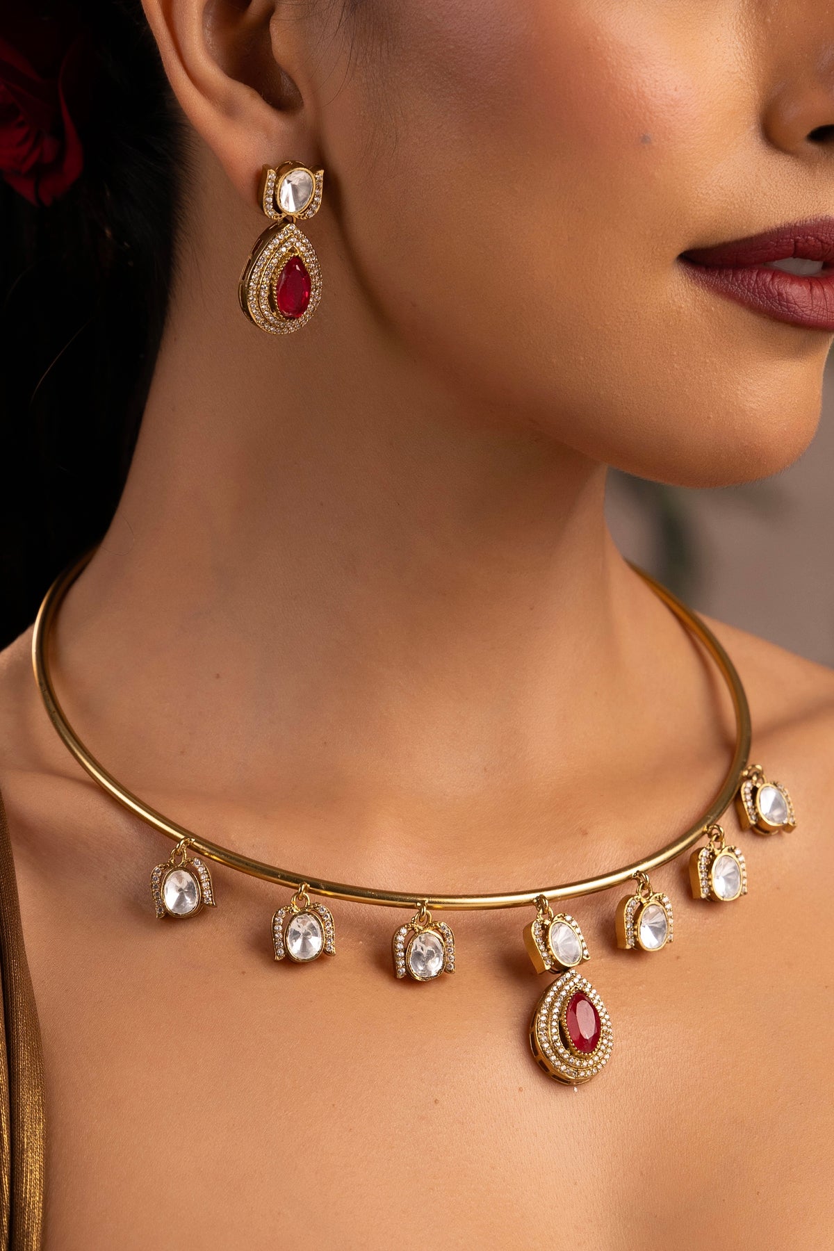 The Pallavi Ruby Polki Hasli Set is elegance distilled into a single golden curve. Designed with a sleek, minimal hasli silhouette, it rests gracefully along the neckline, creating a refined yet striking statement. Delicate polki motifs line the arc like tiny moons in formation, each shimmering softly against the warm gold finish.