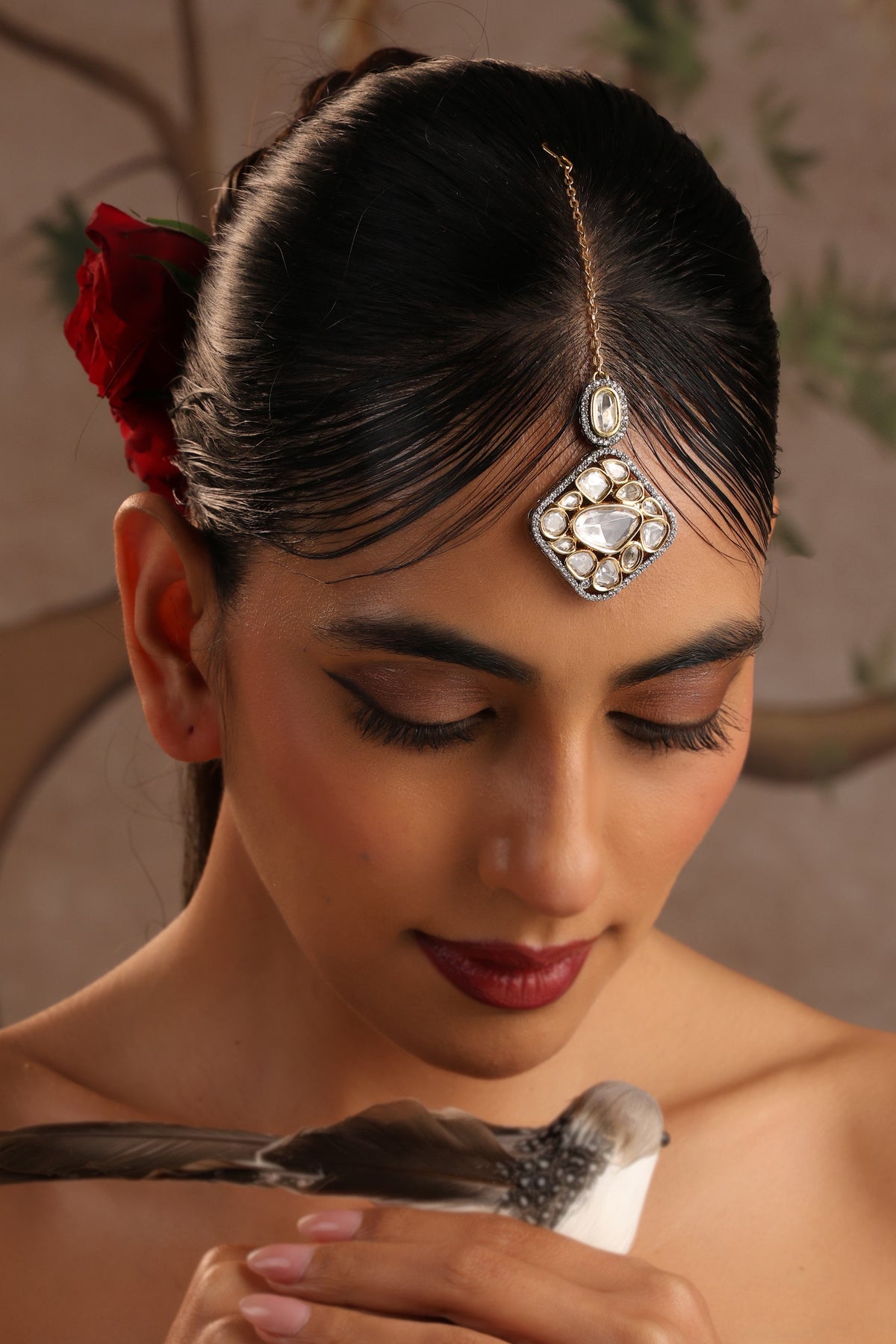 Bold yet exquisitely graceful, the Vidari Gold Polki Maang Tikka is a striking piece that celebrates timeless heritage. At its heart lies a radiant polki centerpiece framed within a beautifully detailed geometric motif, surrounded by shimmering stones that enhance its regal brilliance. Set in a rich gold finish, the design reflects classic craftsmanship with a contemporary edge. The elegant drop structure sits gracefully on the forehead, creating a captivating focal point for bridal and festive looks. Vidari is the perfect blend of grandeur and sophistication, adding a royal glow to every celebration.