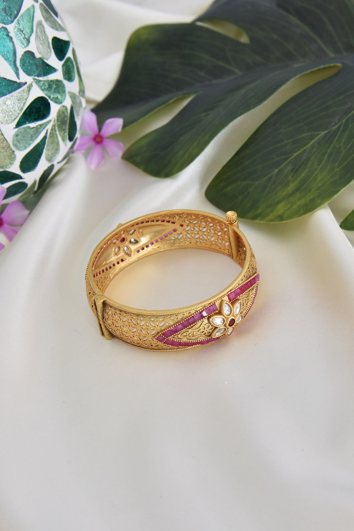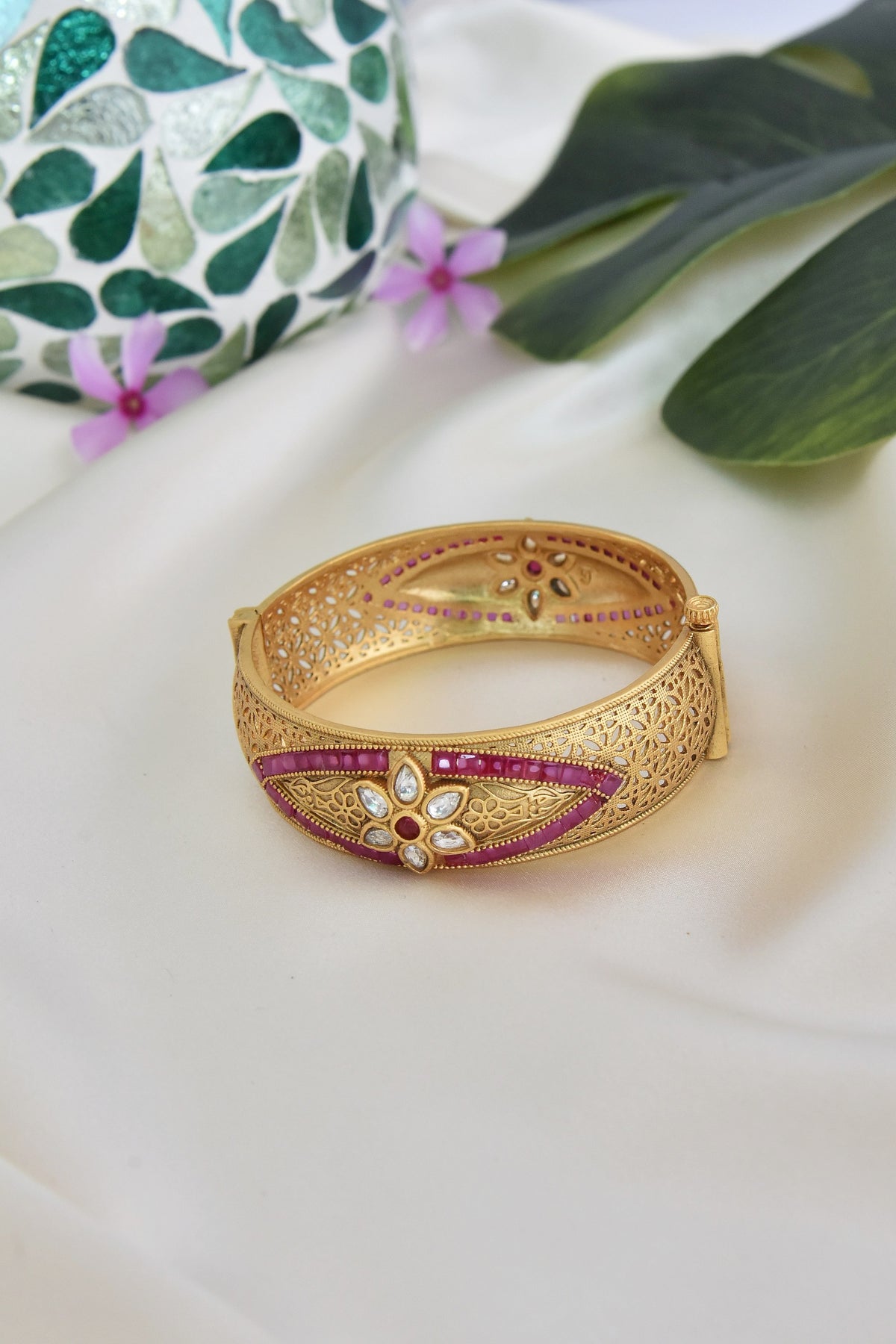 Kaveri Red Gold Plated Temple Work Bangle. This bangle's embossed temple work and semi-precious stone setting are inspired by the conventional South Indian method of jewellery manufacturing. In the middle of a large eye-shaped pattern, multicolored stones are arranged in a floral pattern. It has a little glitz to give it a more genuine feel. For many years to come, pass it down to the family. It is full of elegance and whimsical appeal for all old-world enthusiasts. You will get exactly what you are looking for!